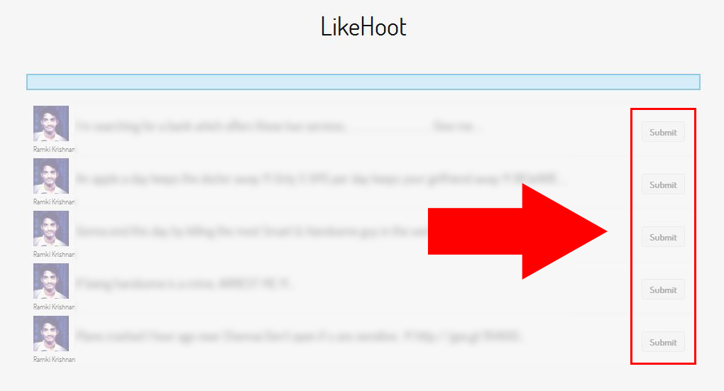 • Next page you get will be having your 5 recent updates with a subscribe button corresponding to each. Click on the submit button of your update for which you need hooping likes.