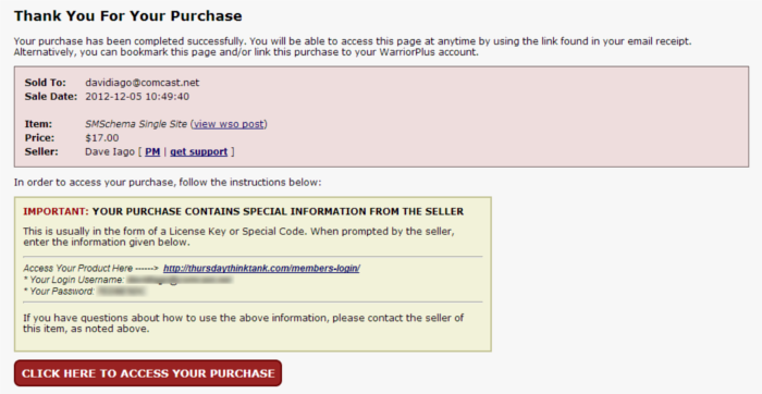 After purchase you will get an email but you can access your SMSchema from the Warrior Plus Dashboard: