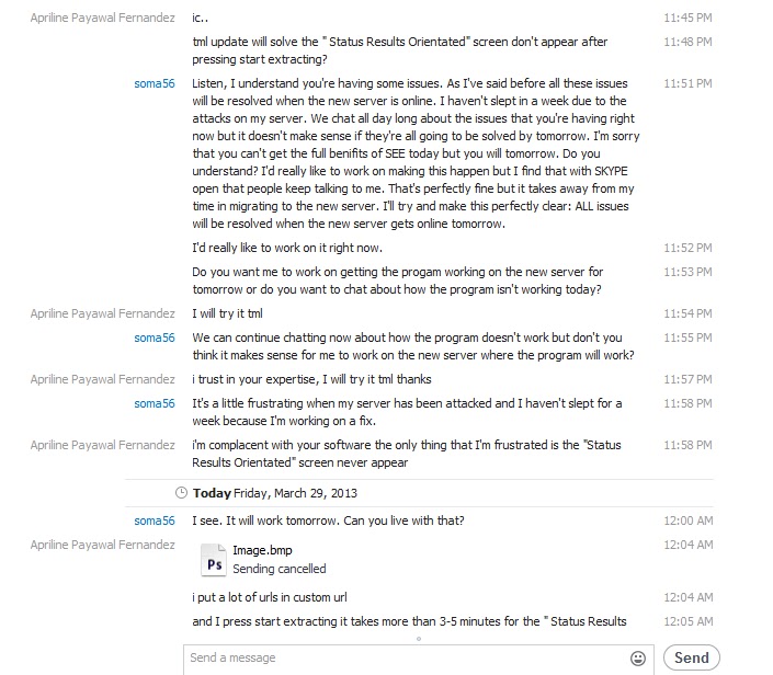 We chat all day long about the issues that you're having right now but it doesn't make sense if they're all going to be solved by tomorrow. I'm sorry that you can't get the full benifits of SEE today but you will tomorrow. Do you understand? I'd really like to work on making this happen but I find that with SKYPE open that people keep talking to me. That's perfectly fine but it takes away from my time in migrating to the new server. I'll try and make this perfectly clear: ALL issues will be resolved when the new server gets online tomorrow.