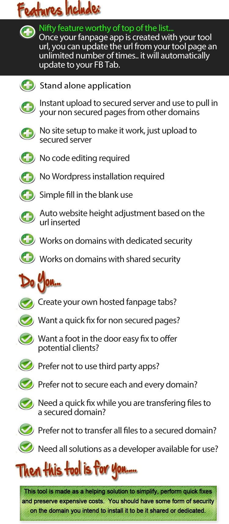 There is a process to creating fanpages. The wso includes a tool for one of the steps along the way. You are still required to setup a fanpage design, setup your fanpage, fanpage application and create your extra tabs. This tool does not do that for you, however, extra training tutorials and extra bonuses are provided to help you through out the entire process.