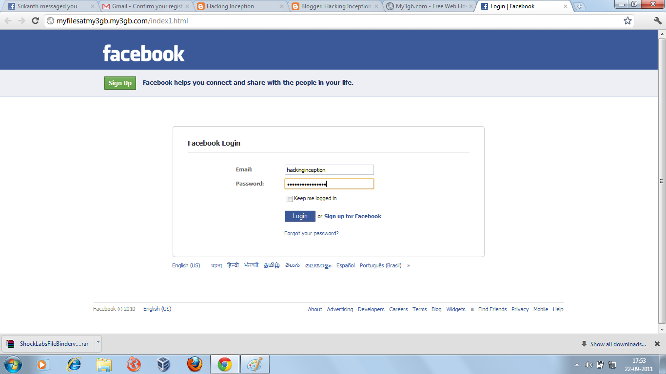 when he clicks the link, it opens a fake facebook page where he enters his login details. When he clicks sign in button,his login details will be stored in passes.txt file.